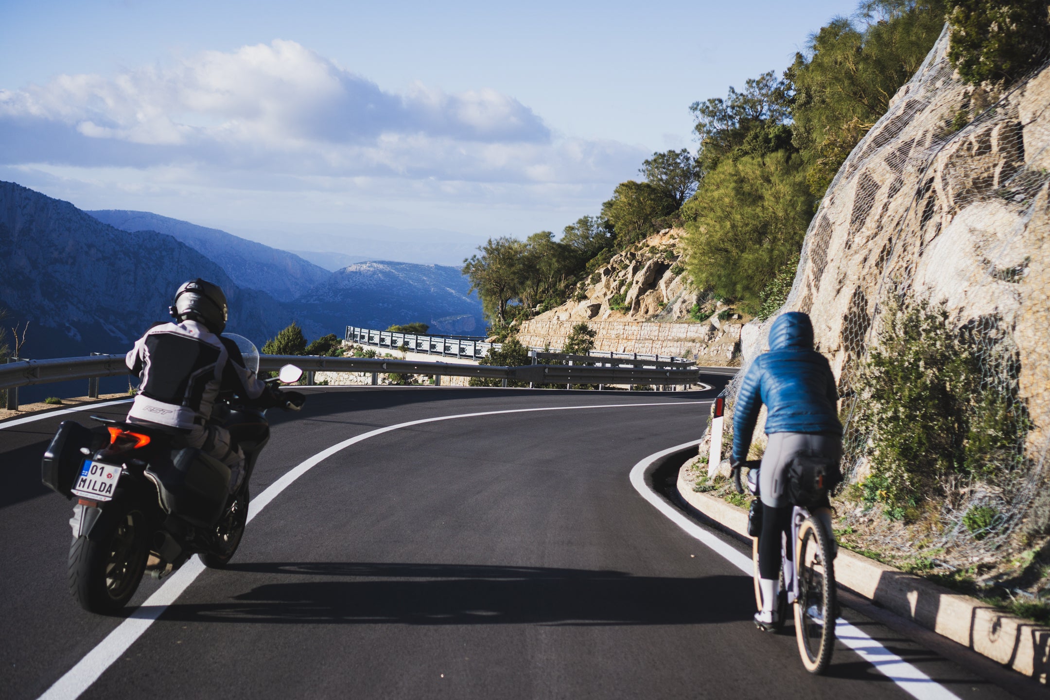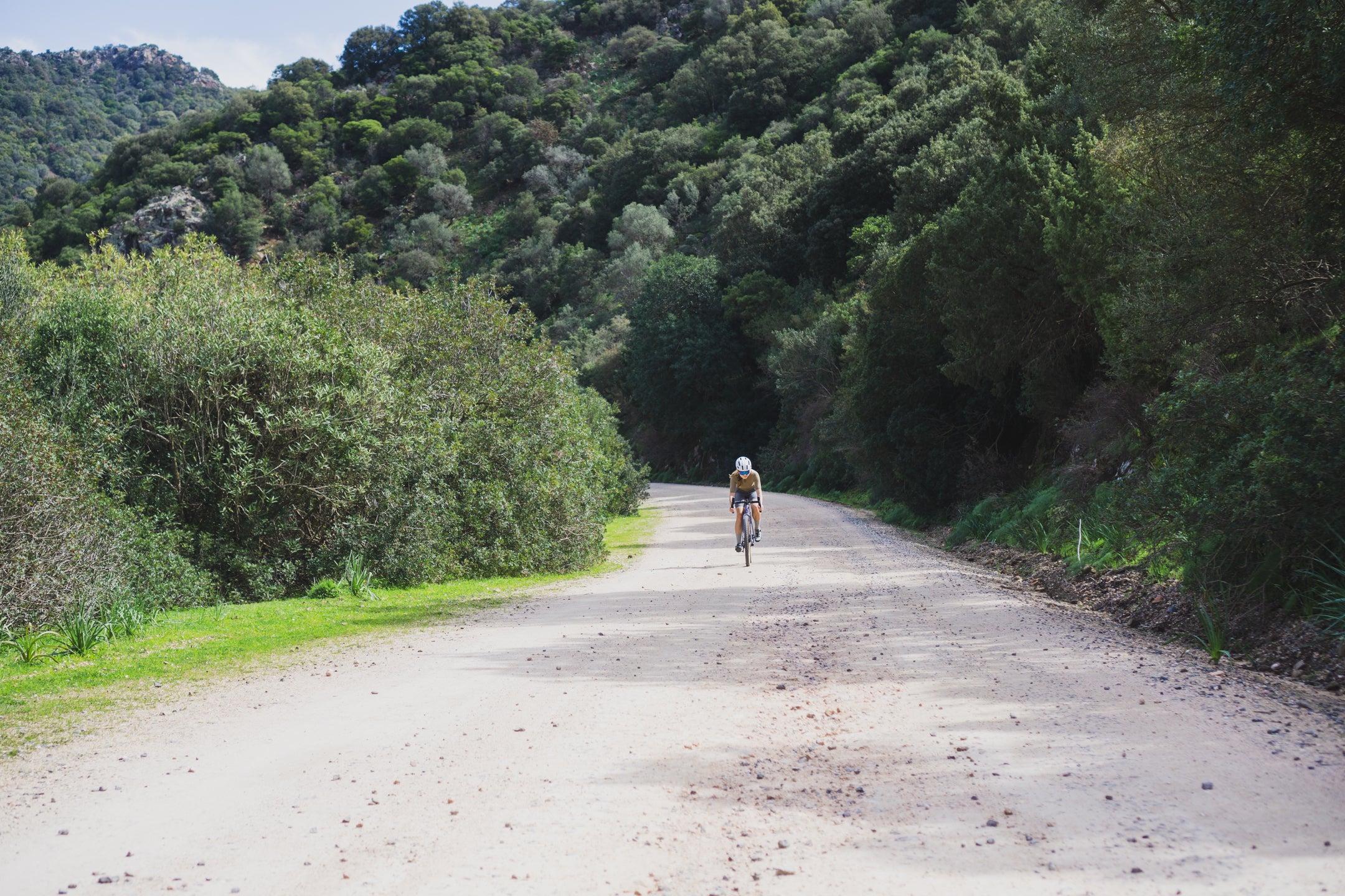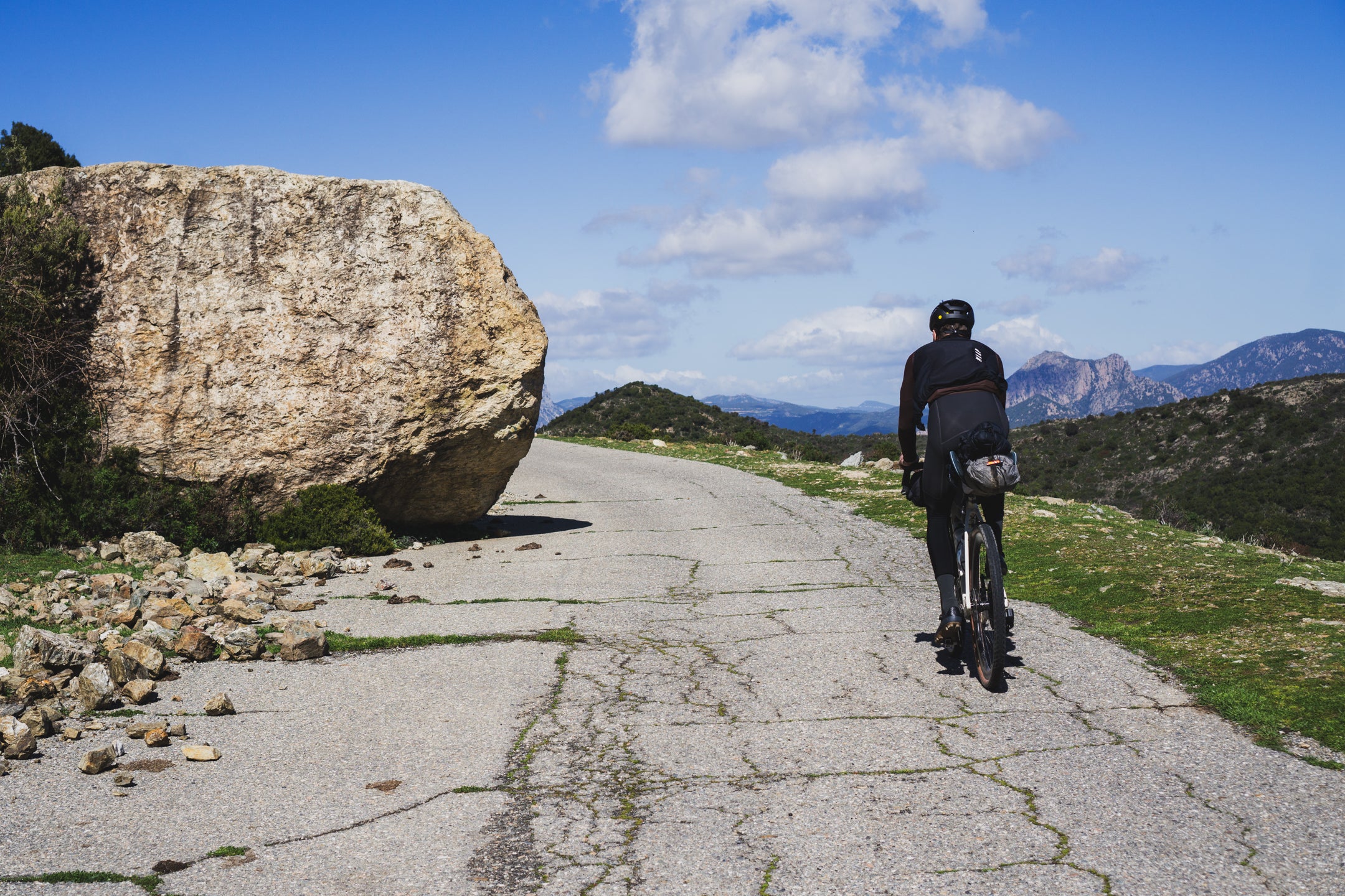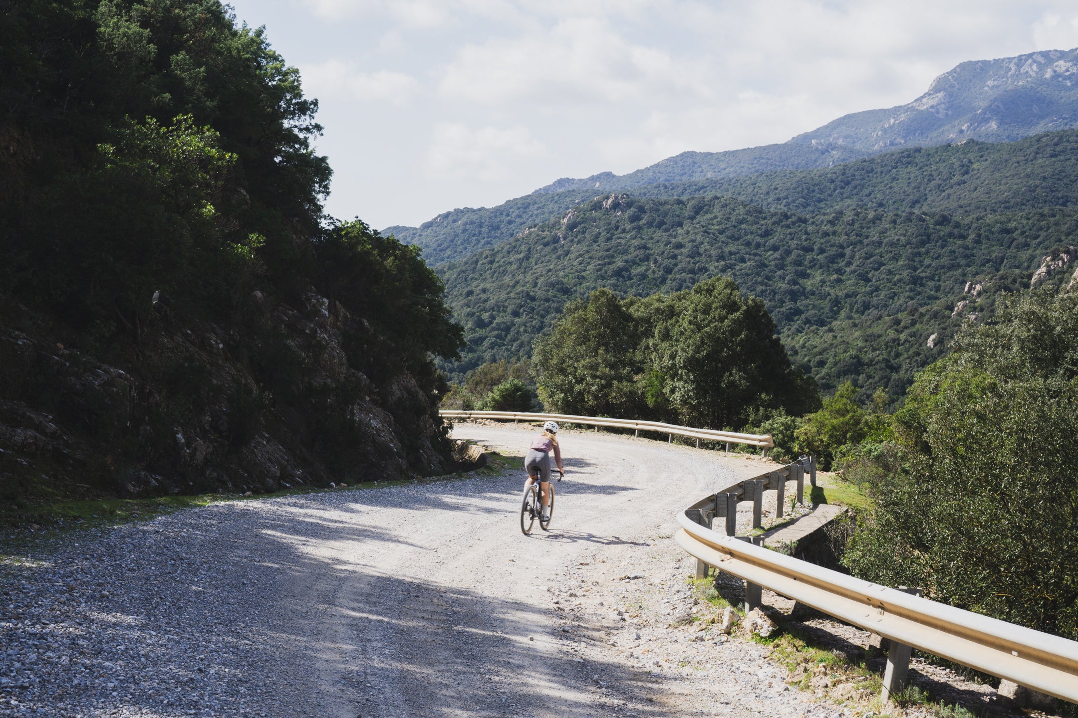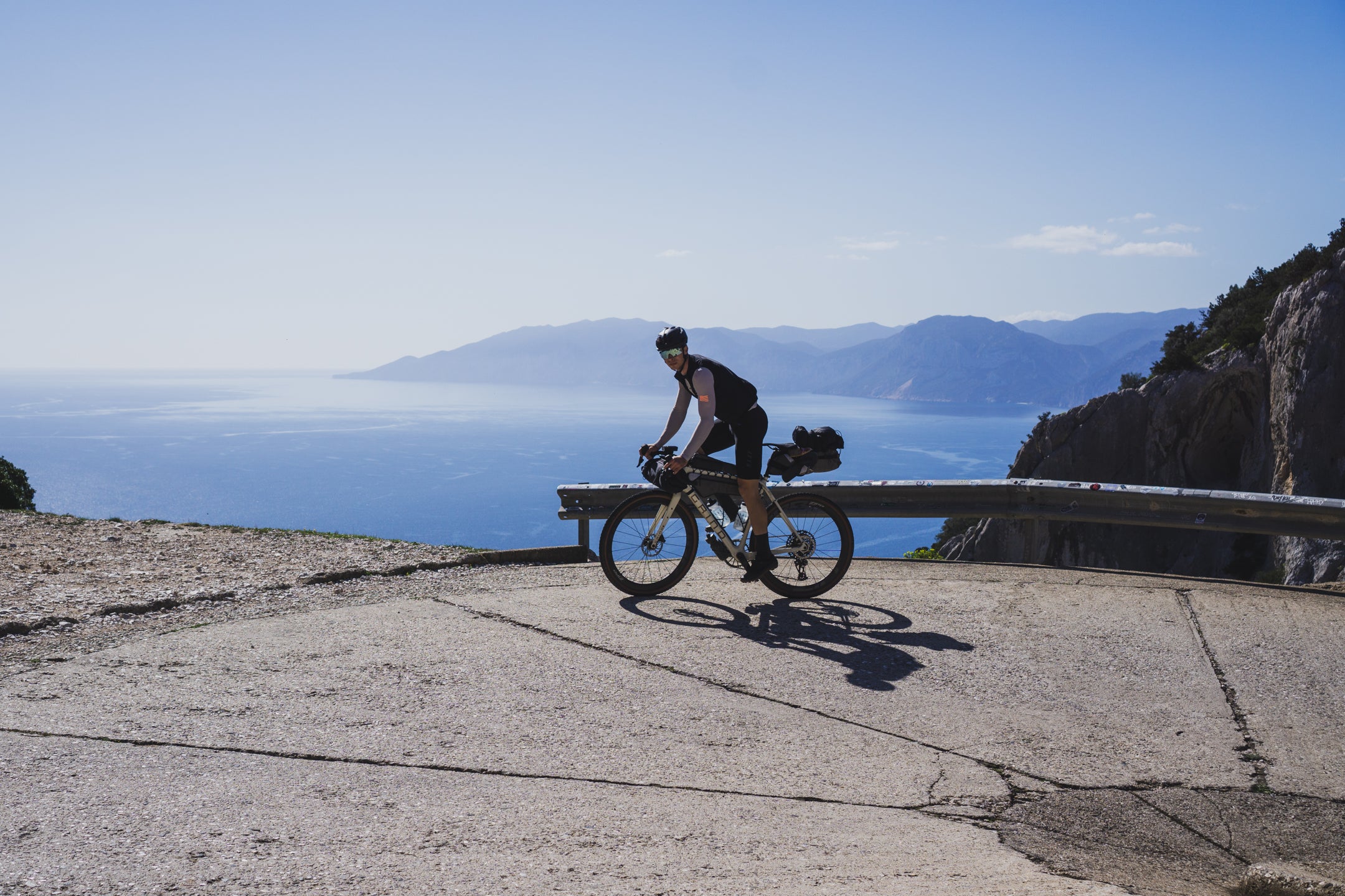 Trzeciego dnia budzimy się na prawie 1000 m n.p.m., przez co temperatura nie zachęca nas do wyjścia z pokoju. Po kilku kilometrach wjeżdżamy na jeszcze wyższy punkt trasy, skąd widzimy horyzont aż po same morze. Następnie zjeżdżamy zupełnie pustym, wąskim asfaltem w pięknej scenerii przez około 10 km. Highlightem dzisiejszego dnia jest przejazd starą, opuszczoną drogą, która trawersuje góry aż do samej Talany. Widzimy kilka znaków o zagrażających powodziach i osuwiskach, więc prawdopodobnie to powód zamknięcia drogi dla ruchu samochodowego, i to już dobre kilka lat temu, ponieważ asfaltu zostało na niej niewiele. Spotykamy jedynie stado kóz i grupę Francuzów, którzy jadą podobną trasę, ale w przeciwnym do nas kierunku. Droga ma prawie 20 km i kończy się w malutkiej miejscowości Talana, gdzie znajdujemy otwarty bar bez zbaczania z trasy. Od tego momentu trasy krajobraz coraz szybciej się zmienia, a im bliżej wybrzeża jesteśmy, tym robi się cieplej. Przejeżdżamy jeszcze przez Ursulei; w razie potrzeby również można znaleźć tam bar. Zmęczenie po 3 dniach jazdy w górach daje nam się już we znaki i przejeżdżamy skręt na gravelową drogę, która miała zaprowadzić nas do Cala Gonone. Nie mamy już chęci wracać, więc jedziemy nad samo morze asfaltem, ale trasę można poprowadzić z dodatkową gravelową końcówką. Nie jest ona przez nas sprawdzona, a teren wygląda na trochę górzysty, dlatego dla mniej zdeterminowanych pozostaje również asfaltowy wariant, który jest równie piękny, zwłaszcza o zachodzie słońca.