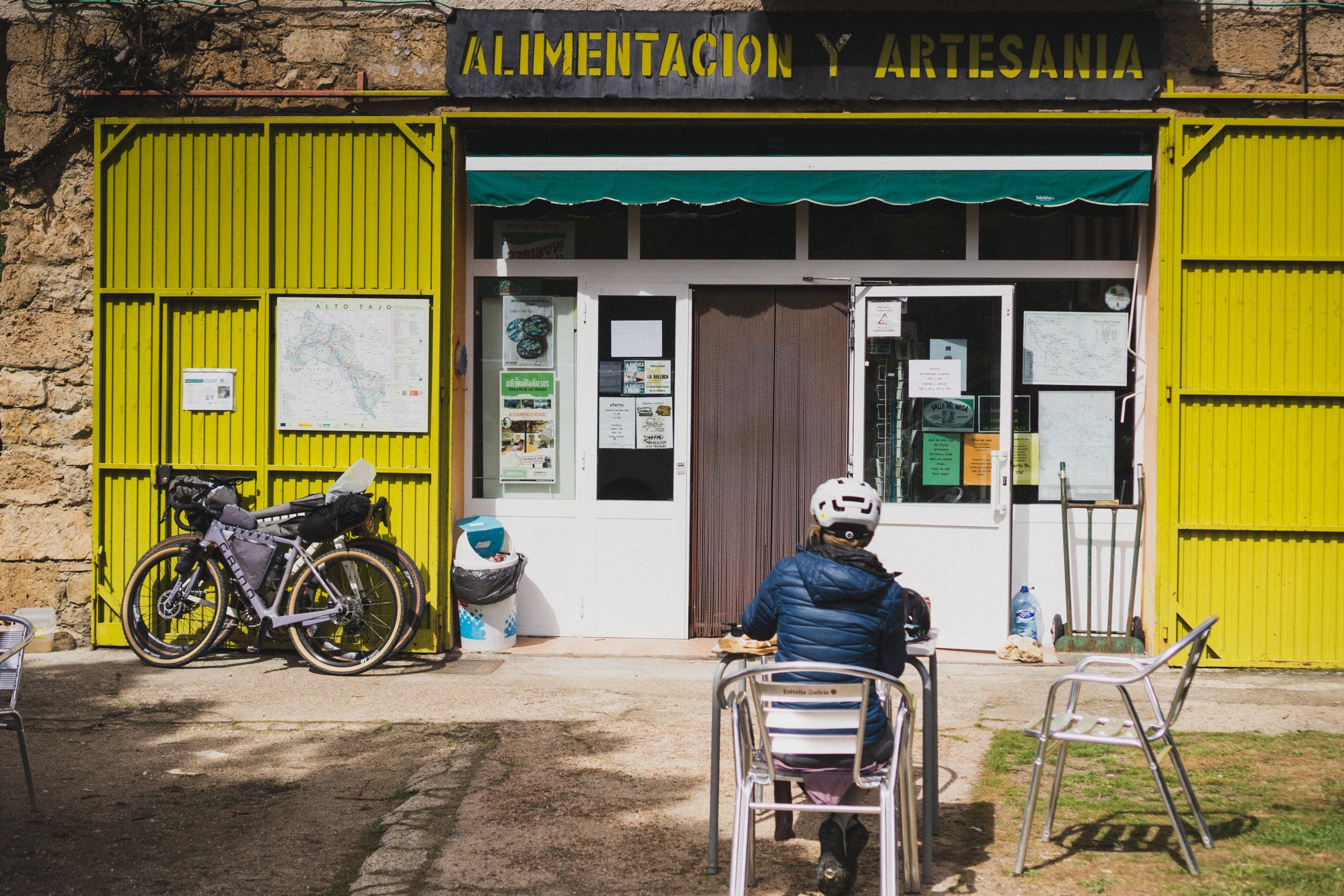 Zanim wyruszymy na trasę Montañas Vacías, jedziemy na 20-kilometrową przejażdżkę wokół miasta, której głównym celem jest sklep i serwis rowerowy Surya Bikepacking. Tam możecie kupić oferowany przez Ernesto, twórcę trasy, zestaw „pamiątkowy” (papierowa mapa trasy, naklejki, naszywka z logo MV), z którego dochód przeznaczany jest na wyposażenie znajdujących się na trasie punktów z najpotrzebniejszymi rzeczami (dętkami, oponami, narzędziami rowerowymi itp.). Jest to świetna inicjatywa i warto ją wesprzeć. Dodatkowo, w sklepie Cristiny i Israela możecie dokupić np. butlę z gazem czy inne potrzebne na ostatnią chwilę przed bikepackingiem rzeczy. Właściciele są niesamowicie mili i zainteresowani historiami każdego ze swoich klientów, co możecie zobaczyć na ich Instagramie @suryabikepacking.